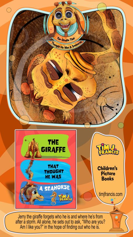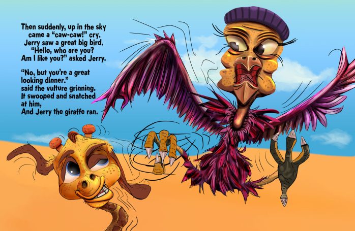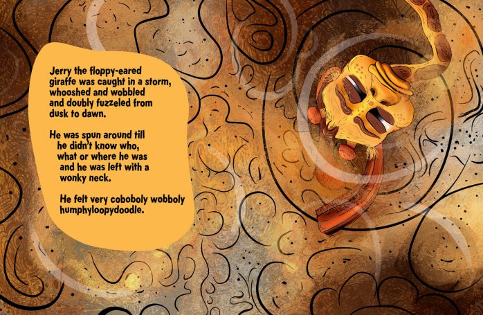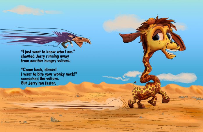 Jerry the giraffe forgets who he is and where he’s from after a storm. All alone, he sets out to ask, “Who are you? Am I like you?” in the hope of finding out who he is.